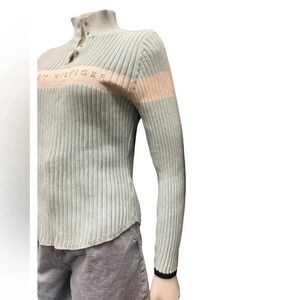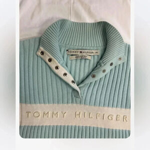 Vintage Tommy Hilfiger light blue/ white ribbed cotton sweater 6 snap button neck cuff closure. Navy hem line on cuffs.