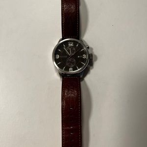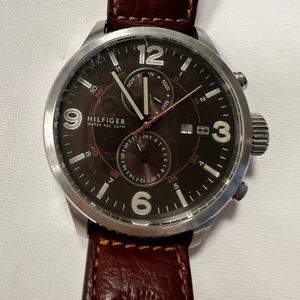 Stainless Steel Tommy Hilfiger watch. In good condition, with brown leather wrist band. Shows sign of wear but overall in good contain just needs a brand new battery.