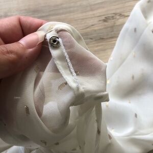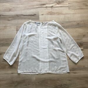 This white blouse by Tommy Hilfiger features a boxy, relaxed fit with a buttoned front, making it a versatile addition to any wardrobe. The 3/4 length sleeves and subtle texture add a touch of elegance, perfect for both casual and dressier occasions.