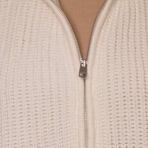 Stay stylish with this white season-less sweater cape. Perfect for layering, this versatile piece will add a touch of sophistication to any outfit all year round. features full front zip opening, curve bottom, side arm openings, cotton/acrylic blend. Excellent pre-owned condition, smoke and pet free home.