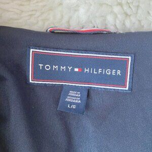 ⋆ A luxurious cream white long-sleeve faux fur coat, highlighted by a bold oversized red zipper with an O-ring loop. The O-ring is adorned with a ribbon in the iconic Tommy Hilfiger colors of blue and white. An embroidered flag decorates the left arm. This cozy sweater-style coat is perfect for staying warm and stylish throughout the fall and winter seasons.