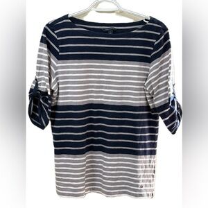 Elegant striped blouse with navy and white pattern. Features 3/4 sleeves with tie detail. Perfect for casual wear.