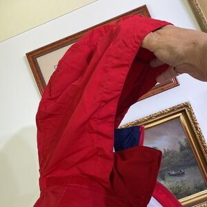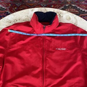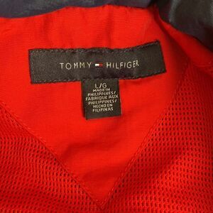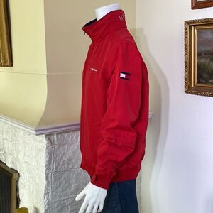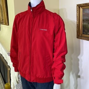 In very good preowned condition classic Tommy Hilfiger performance jacket. Features full front zipper, hidden hood under collar, exterior side pockets and interior pocket. Adjustable Velcro at cuffs, ribbed jersey at hip. Jersey is a bit stretched but still has stretch and looks great.