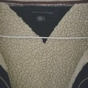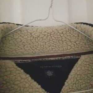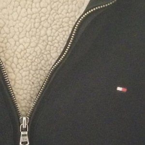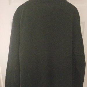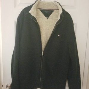 Warm comfortable jacket. It is either fleece or wool lined knit inside. Size Medium. From armpit seam to end of sleeve 20"/ from armpit seam to end of jacket 15". Has been warn a fair amount, has no real damage, fleece lining inside shows bit of impact or flattening to lining around neck and bottom but not really noticeable. Pet-free/smoke-free. Elbow patched design. No outside pockets, custom made interior coat breast pocket for phone and pen. Dark Navy Blue.