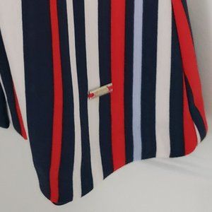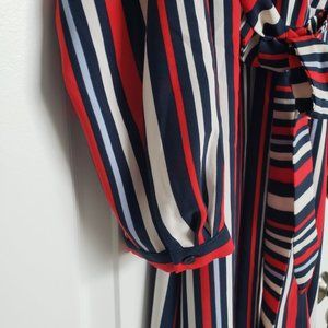 All season nautical stripes (navy, red white, sky blue), plunge neckline, long sleeves, with belt