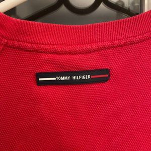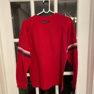 Tommy Hilfiger red long sleeved tee for men with blue and white stripes on sleeves. 100% cotton, size XL.