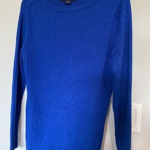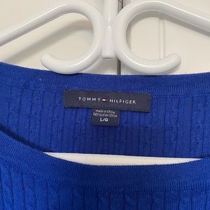 If you like blue you'll love this long-sleeved, pullover sweater by Tommy Hilfiger in rich royal blue. It's medium-weight, has a fine cable-knit pattern and is in very good condition. This viscose-nylon blend really holds its shape.The fit is slim, longish, ends just below the hips on me (I'm short-waisted).