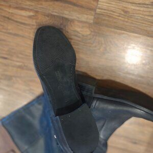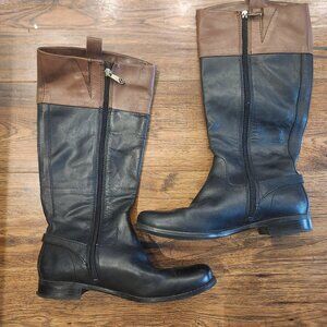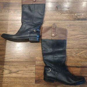 Tommy Hilfiger tall riding boots in black and brown leather. Size 8.5. Excellent condition. Worn only a couple of times. Gold accents. Low heel