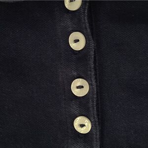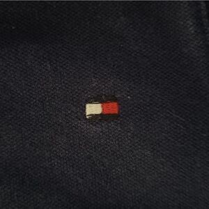 Very good used condition, just a little bit of fading due to type of material and dark colour, Tommy Hilfiger navy blue collared with pearlized buttons tennis polo style dress. Gathered skirt with polka-dot ribbon trim. Cotton and Elastane blend. Size 18 months