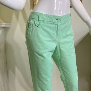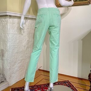 In very good preowned condition classic chinos from Tommy Hilfiger in lovely mint green. Mid rise, slim straight legs, 30” inseam, slit side pockets, buttoned back pockets, belt loops, 100% cotton.