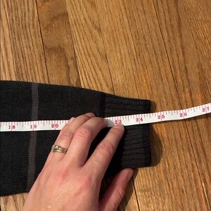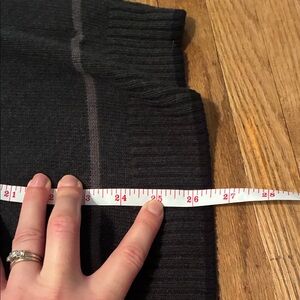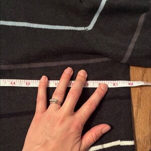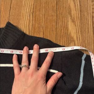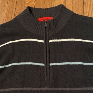 Upgrade your style with this classic black three quarter zip-up sweater featuring elegant blue and white stripes. Ideal for a modern, layered look. 100% cotton. In excellent condition. The material is quite stretchy.