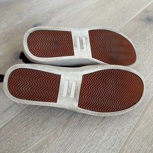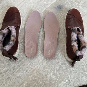 Toms burgandy brown distressed leather slip-on booties, has pink animal faux fur trim, tassel trim attached to heel, and clean removable insoles, and sneaker looking soles. Looks like a bootie but wears like a sneaker!