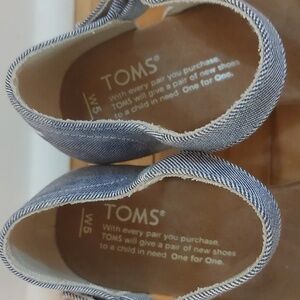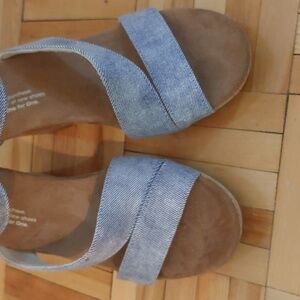 Toms Clarissa cork wedges denim sandals size 5W, in good condition, has 2 stains on denim see photos. heel is 3"