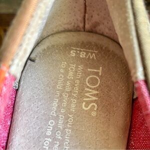 Size 8.5 Toms wedges, featuring a chic espadrille design and a vibrant multicolour palette. With a fabric upper and a peep-toe opening, these sandals are a must-have for Summer. In good pre-owned condition.