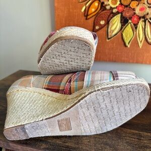 Toms| Cute Summer Tan/Blue/Orange 3.5” Wedge Open Toe Espadrille Shoes Sz 8.5