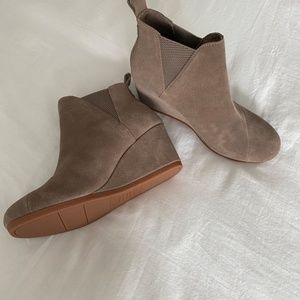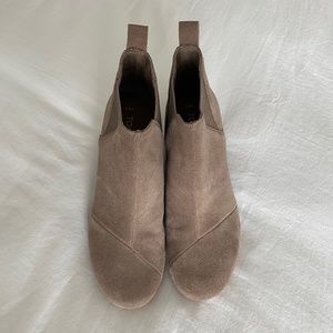 Never worn Kelsey booties from Toms. I love these but the color just isn't right for me. Tom's tend to run a little large so these are an 8.5 but I am normally a 9 in other shoes. Leather Suede upper. Heel height is approx 2 3/4 ". These are currently available on the Tom's site for $110 but not in this color. Snag these beauties while you can!