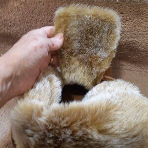 Stylish brown suede ankle boots with a cozy faux fur trim. Leather ties and flat rubberized soles; moccasin comfort.