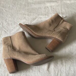 Step out in style with Toms tan heeled boots, showcasing a breathable perforated suede-like texture and a chic open-toe design. These versatile boots are perfect for adding a modern touch to any outfit, whether for a casual day out or a dressier occasion.