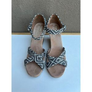 Toms Womens Size 9 Black White Canvas Cork Wedge Sandals Open Toe Ankle Strap