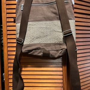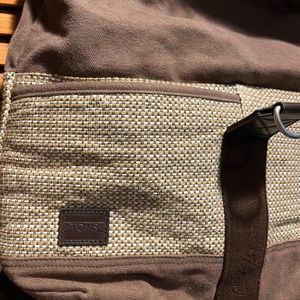 Toms woven fabric backpack with front clasp, adjustable straps and two interior slip pockets. Perfect for beach or summer in the city.