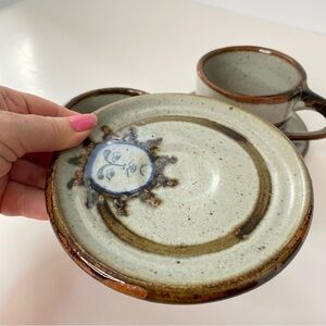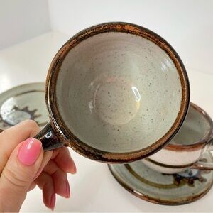 Cocotzin Tonala Artisan signed from Mexico Set of Two Hand Painted Cups and saucers. Design is a sun design in browns blues and greys. Vintage in great condition. No chips or cracks.