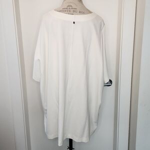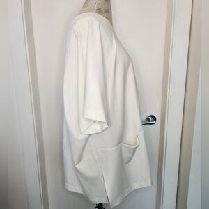Pristine white jersey knit crewneck short sleeve tunic top with large front pockets, by Toni T.