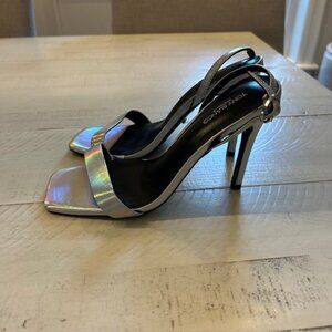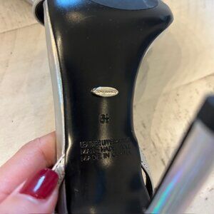 Iridescent metallic leather upper with manmade sole and silver-tone hardware. Imported. Slingback styling with adjustable buckle closure. Leather lining. Square toe. Approx 100mm/ 4 inch heel. Revolve Style No. TONR-WZ481. Manufacturer Style No. FELYX.
