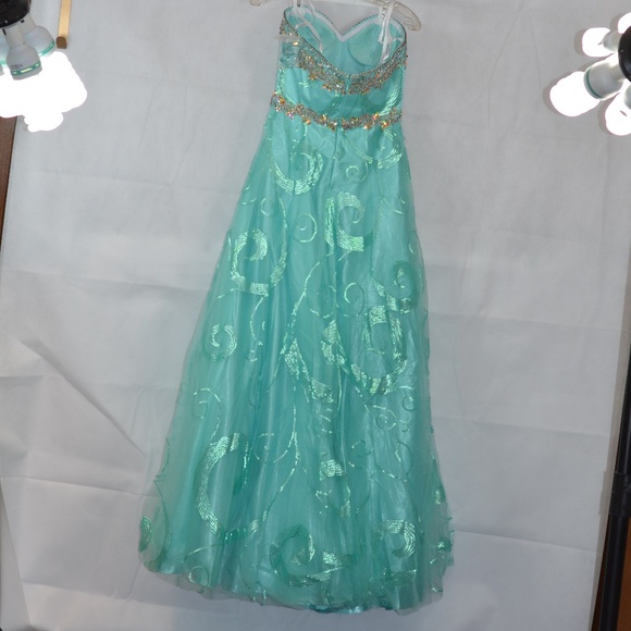 Sweet Dress. Love this color! Full of Rhinestones and beads on the bodice. This is a New Dress with the little plastic bag of straps, the tag went missing, but it is NEW. Tony Bowls Le Gala SZ 8