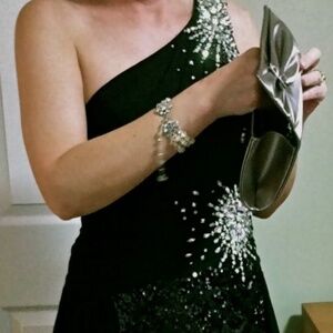 Tony Bowls Shoulder Sash Black Sparkly Maxi Evening dress; US women's size 6