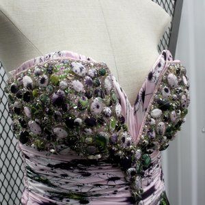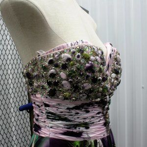 - the embellishments on the bodice are a mix of covered buttons (in the same fabric) and beads and sequins. It is heavy, but also extremely well sewn.