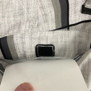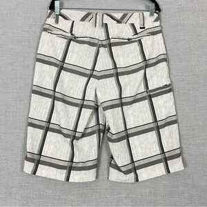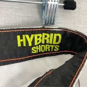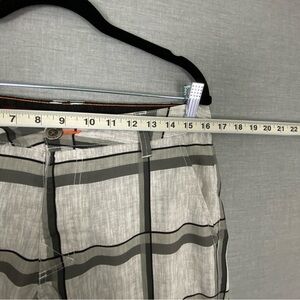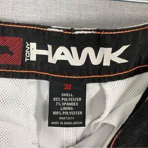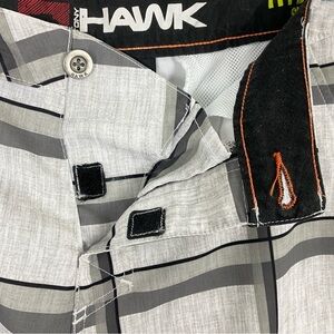Tony Hawk Hybrid Shorts. Men's tag size 32. Polyester / spandex blend. Lightweight and breathable. Gray on gray block pattern. 5 mesh lined pockets. Velcro and button close.