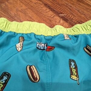 Board shorts, teal and lime. Summer snacks and cool treats graphic Size Large youth. Front Tie waist with back elastic waistband. brief lining and large strong hold Velcro pocket . Gently worn. Soft & lightweight,ultra quick dry. High quality fabric, shows no signs of wear.