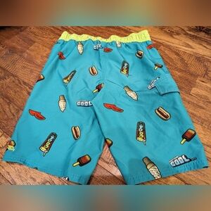 Board shorts, teal and lime. Summer snacks and cool treats graphic Size Large youth. Front Tie waist with back elastic waistband. brief lining and large strong hold Velcro pocket . Gently worn. Soft & lightweight,ultra quick dry. High quality fabric, shows no signs of wear.