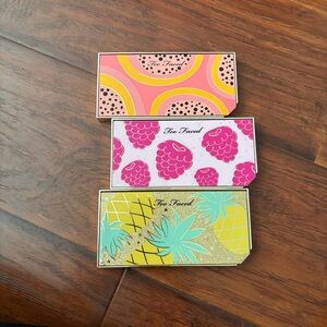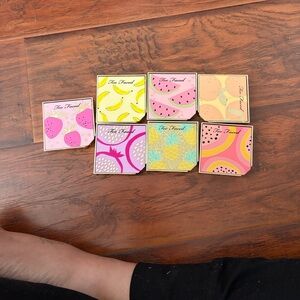 Colorful palettes with banana, watermelon, and pineapple designs. Features pink, yellow, and turquoise shades. Condition as shown. Great for a collector. Collection includes 6 blush and highlighter duos, one bronzer highlighter duo, and 3 eyeshadow palettes.