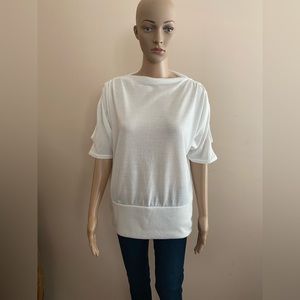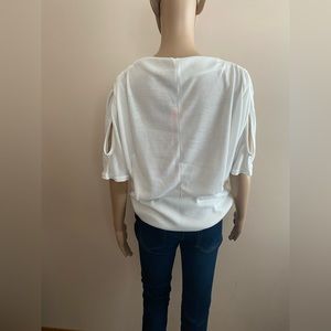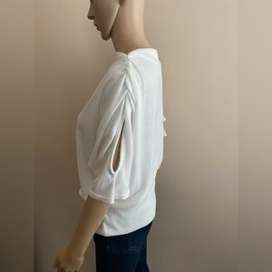 White Knit Short Sleeve Top. Ribbed Hem. Ruched Shoulder with Teardrop Cut-out in Sleeve.