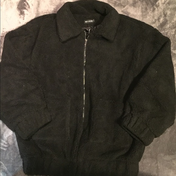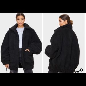 The jacket is an oversized Teddy Jacket in size Medium. It can also fit a Large.