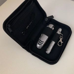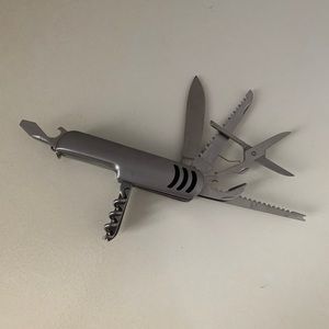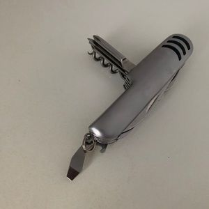 Multi-purpose tool set with flashlight and keychain extension. 11 different tool heads. Silver finish. Great for travel. Excellent condition.