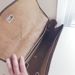 This is a beautiful caramel leather purse covered in hand done tooling. It's got a brass turn closure thingy and little feet on the bottom, and 3 inside pockets. It's unlined and the leather is stiff and sturdy. The strap isn't very adjustable but is a good all around length.