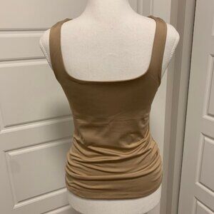 To be worn in 2 ways: the scoop neck or the crew neck. Double layer in ultra-soft stretchy recycled polyester. Fitted. Tan color. Composition: elastane, polyester. Very good condition.