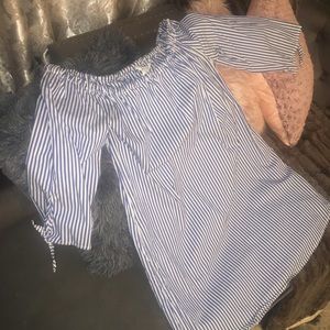 Blue and white striped top with tie details on the sleeve. Can be worn on or off the shoulder.