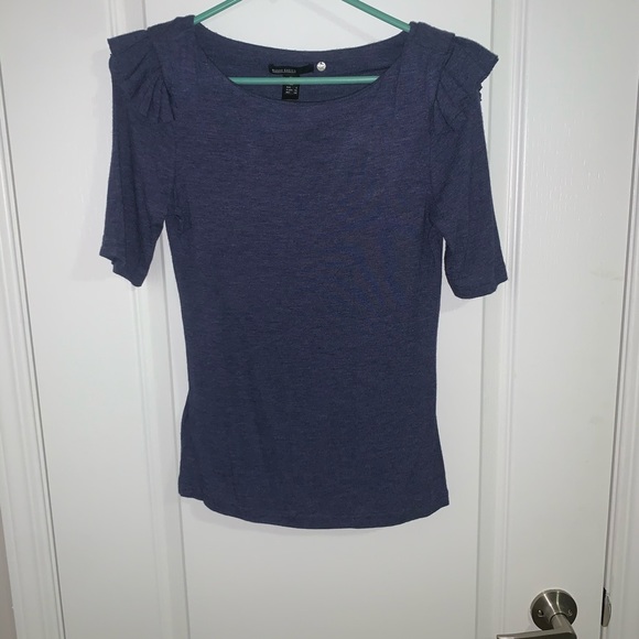 Blue Top with a little padding at the top of the shoulder Also has some ruffles The material of this top is really soft,and stretchy
