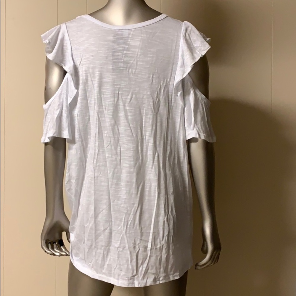 White short capped sleeve with peek a boo shoulders. Never been worn, just needs an iron.