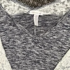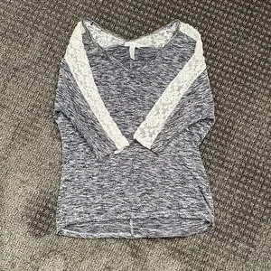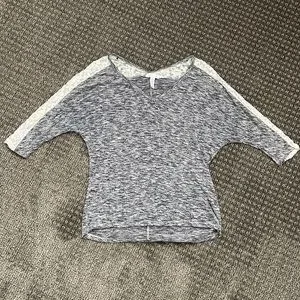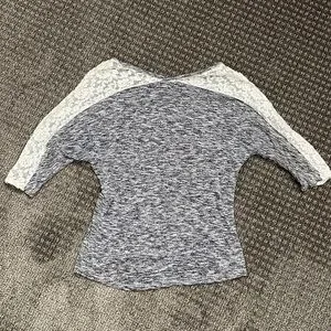 Dressy top with quarter sleeves, lace around the neck and arms. Loose fitting, super cute + stylish.