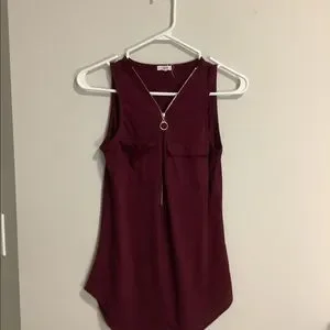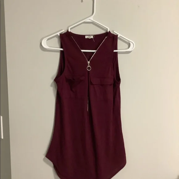 Thread in the picture is coming off of the sticker not the top. Zipper does mid-way down and zips up/down to your liking. The top is a beautiful maroon colour. Measurements/more photos can be requested.