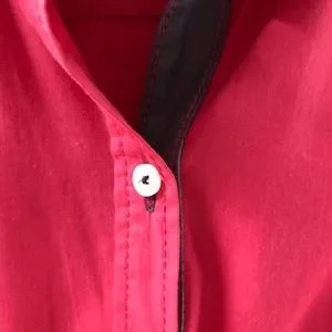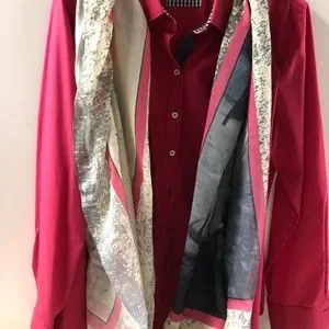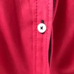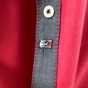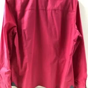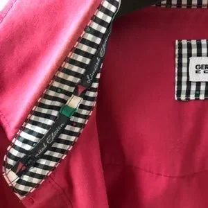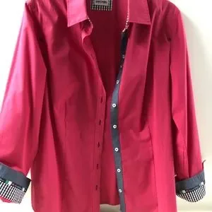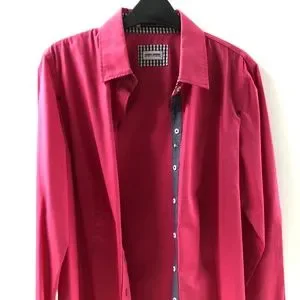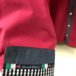 Casual to business wear. Long sleeve collared shirt. Button down with Design print « limited edition » logo on back of cuffs. Trimmings are plead black and white and blue jeans color. Color is washed out red. (Original color). No tag description available. Size is approximate. Medium, fits a little tighter on heavier chest . Could fit a smaller frame as loose fit. Full length: 26 inches. Shoulder to sleeve: 24 inches. If worn with folded sleeve, then would be 21 inches. Underarm to underarm is 21 inches. Very good condition.