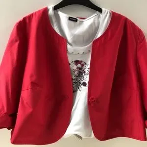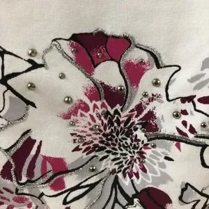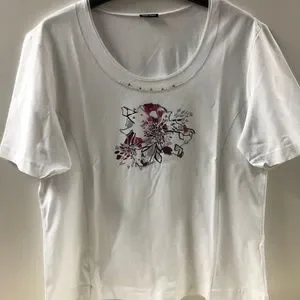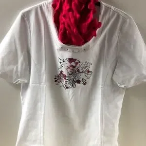 Fashionable short sleeve top, perfect to mix and match your closet. Can be worn alone or with a casual or more elegant top. Flower print pinkish color in the middle with sequin. No description tag available except for make. Excellent condition. Full length 24 inches. Shoulder to sleeve is 10 inches. Underarm yo underarm seam: 20 inches. The item is sold alone and without the displayed accessories on photo which only purpose is to give an example of how it can be worn.