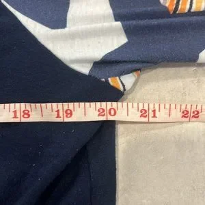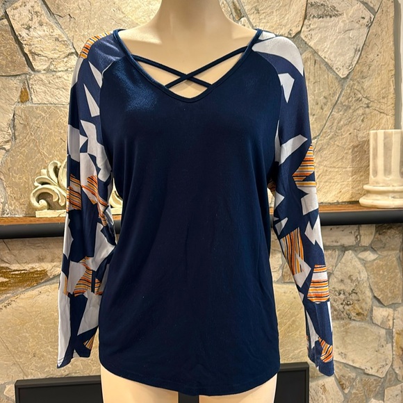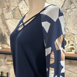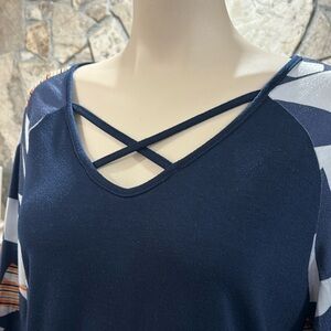 EUC long sleeve top Size is 14W Nice navy blue with multi coloured sleeves V neck with a criss crossed detail