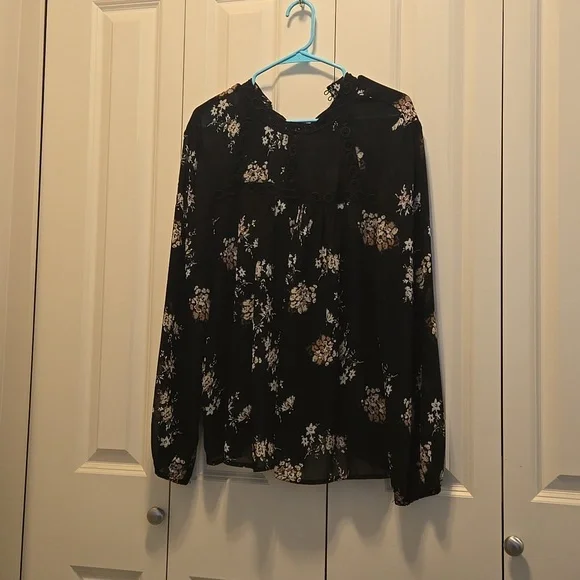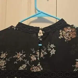 Black sheer blouse with floral design.