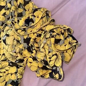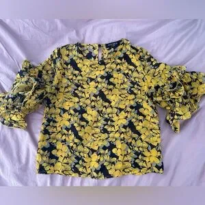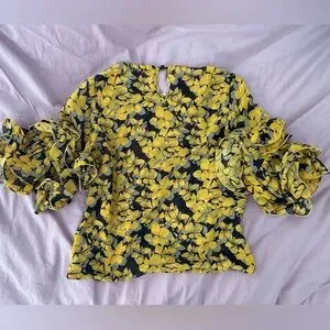 Chiffon balloon sleeve top Sleeves have stiff wiring to keep them poofy Pit to pit 18” Shoulder to waist 21.5” Bright yellow, black and taupe