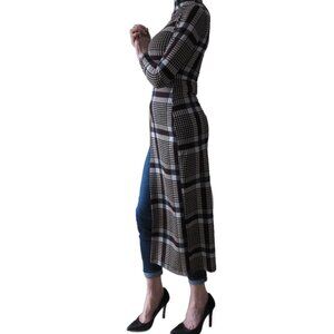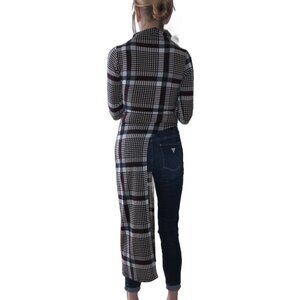 A plaid top that is longer on one side with a high neckline. Super cute and unique.